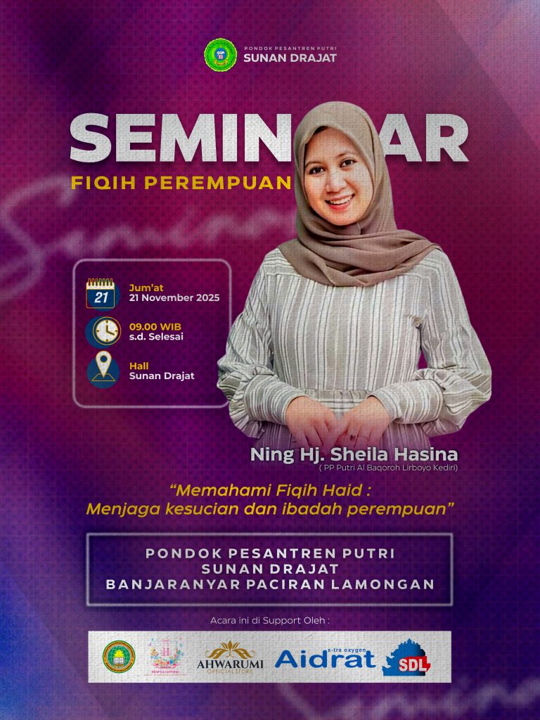 Lamongan — Pondok Pesantren Putri Sunan Drajat, Banjaranyar Paciran Lamongan, kembali menggelar kegiatan edukatif bagi para santrinya melalui Seminar Fiqih Perempuan dengan tema “Memahami Fiqih Haid: Menjaga kesucian dan ibadah perempuan” pada Jumat, 21 November 2025. Acara yang berlangsung di Hall Sunan Drajat ini menghadirkan narasumber Ning Hj. Sheila Hasina dari PP Putri Al Baqoroh Lirboyo Kediri.