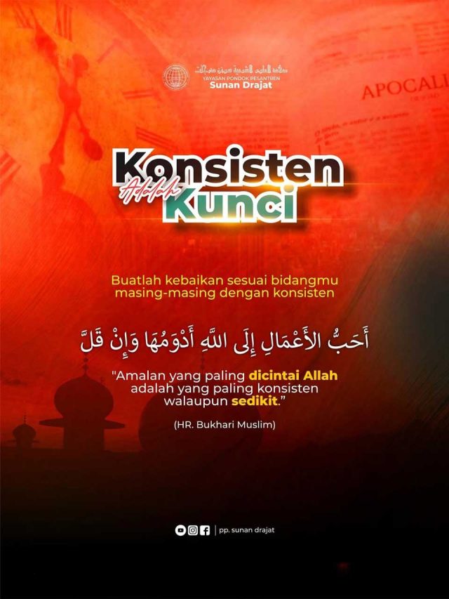 Beranda Story Time StoryTime: Konsisten Adalah Kunci Story Time StoryTime: Konsisten Adalah Kunci Penulis timredaksi - 1 September 2025 108 0 FacebookTwitterPinterestWhatsApp Buatlah kebaikan sesuai bidangmu masing-masing dengan konsisten أَحَبُّ الأَعْمَالِ إِلَى اللَّهِ أَدْوَمُهَا وَإِنْ قَلَّ “Amalan yang paling dicintai Allah adalah yang paling konsisten walaupun sedikit.” (HR. Bukhari Muslim)