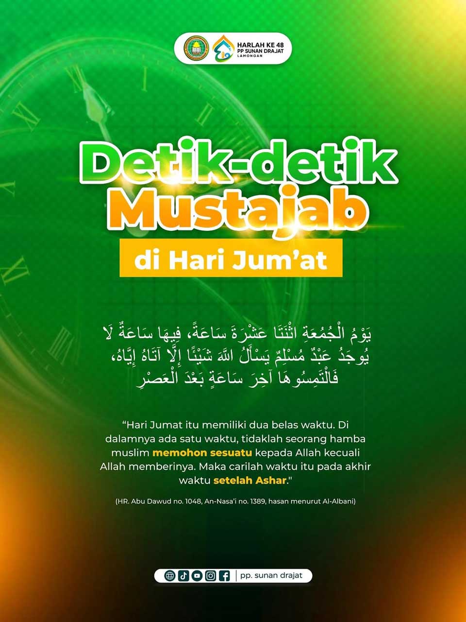 “Hari Jumat itu memiliki dua belas waktu. Di dalamnya ada satu waktu, tidaklah seorang hamba Muslim memohon sesuatu kepada Allah kecuali Allah memberinya. Maka carilah waktu itu pada akhir waktu setelah Ashar.” (HR. Abu Dawud no. 1048, An-Nasa’i no. 1389, hasan menurut Al-Albani)